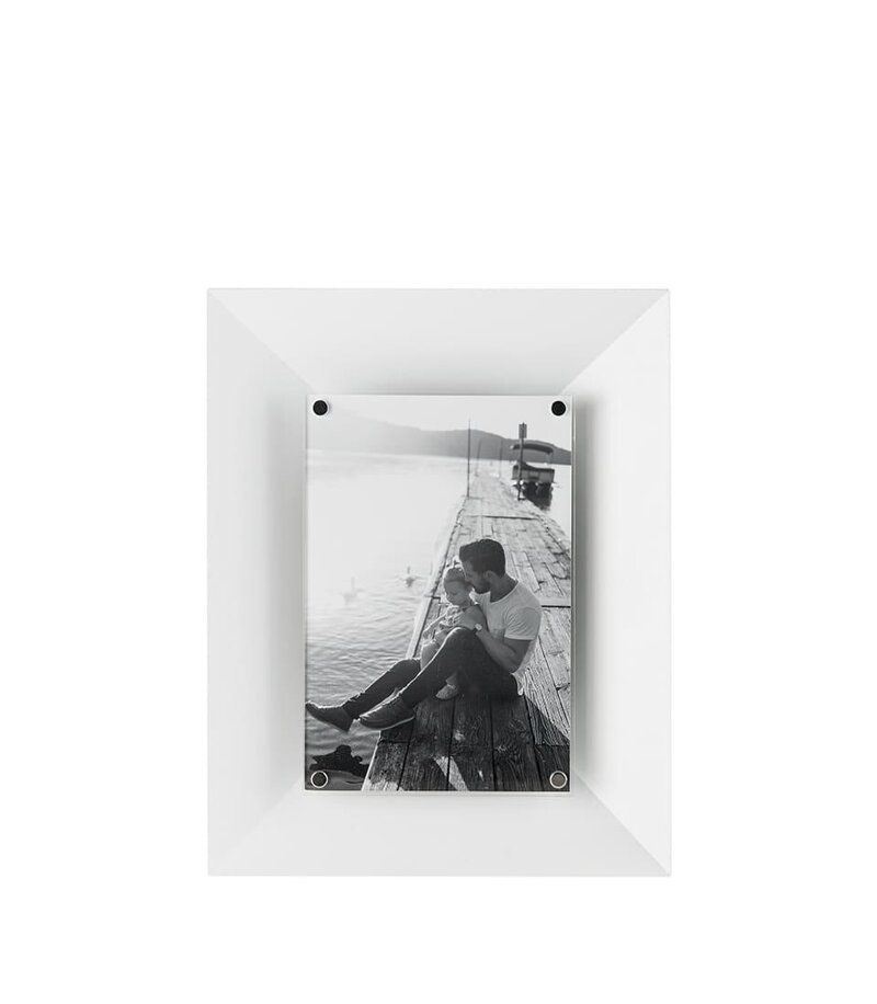 Portafoto rettangolare in acciaio bianco con immagine in risalto. Perfetto per gli amanti delle linee essenziali.